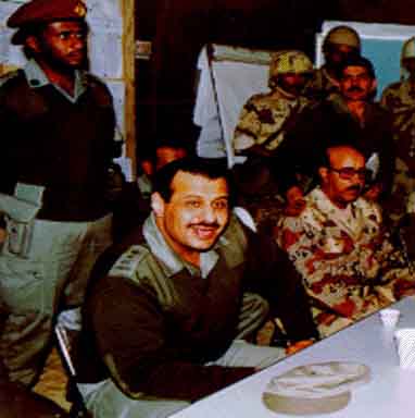 في مركز القيادة مع اللواء الركن سلطان المطيري، قائد مركز القيادة المتقدم في المنطقة الشرقية. ويقف خلفنا العقيد شاكر إدريس، مدير الشؤون العامة، والنقيب زكي السلطان، قائد فصيل الأمن والحماية.