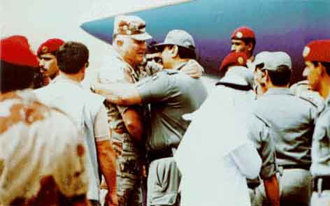 عناق الوداع لنورمان شوارتزكوف عند مغادرته المملكة في أبريل 1991.