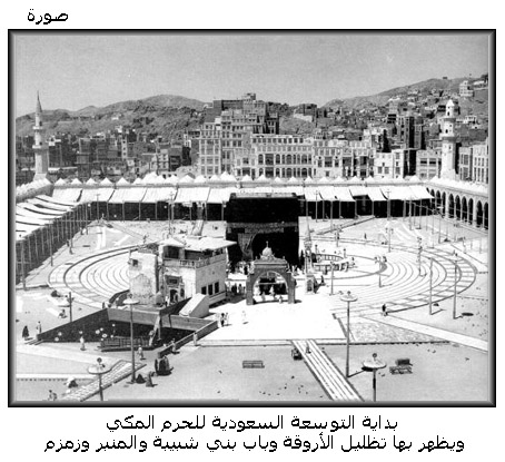 بداية التوسعة السعودية للحرم المكي ويظهر بها تظليل الأروقة وباب بني شبيبة والمنبر وزمزم