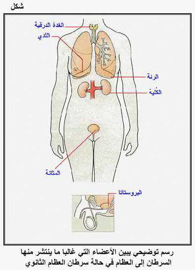 رسم توضيحي يبين الأعضاء التي غالبا ما ينتشر منها السرطان إلى العظام في حالة سرطان العظام الثانوي