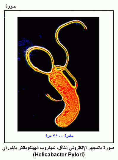 صورة بالمجهر الإلكتروني الناقل، لميكروب الهيلكوباكتر بايلوراي (Helicabacter Pylori)