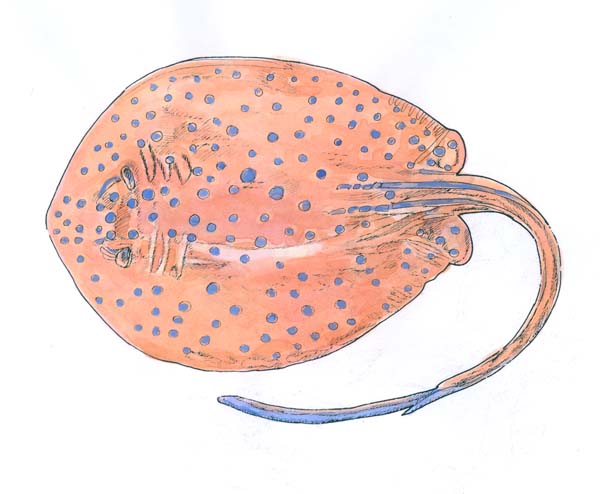 سمكة السفنين أزرق البقع يصل طولها إلى 2.5م وتعيش في المياه الضحلة الشعابية