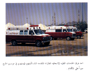 إحدى فرق الخدمات الطبية الإسعافية الطارئة المتقدمة، أثناء تأديتها مهمتها، في موسم الحج، سيراً على الأقدام