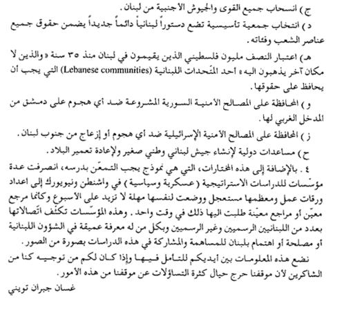 من السفير اللبناني، غسان تويني، إلى وزير الخارجية فؤاد بطرس