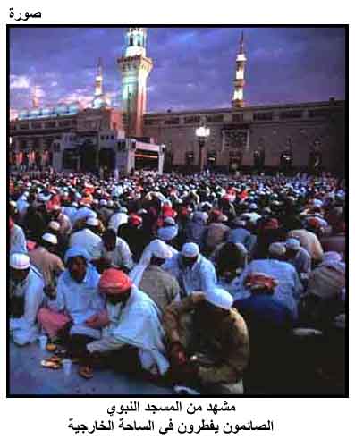 مشهد من المسجد النبوي، الصائمون يفطرون في الساحة الخارجية
