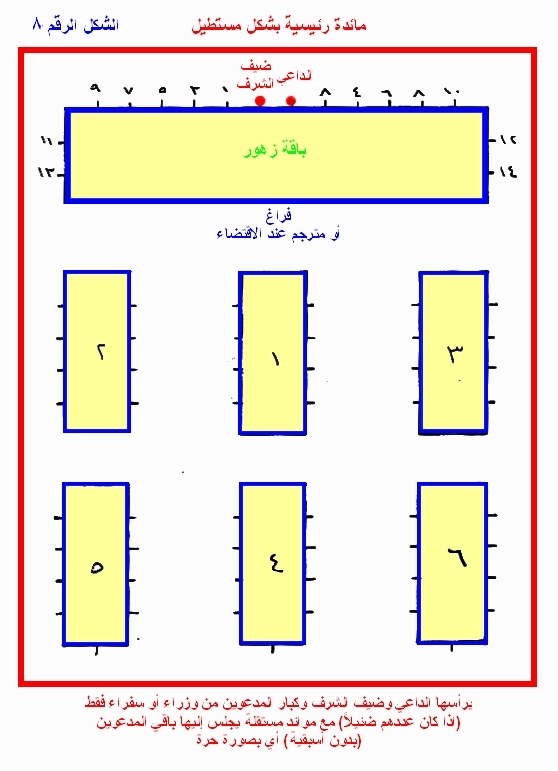 مائدة رئيسية بشكل مستطيل يرأسها الداعي وضيف الشرف وكبار المدعوين